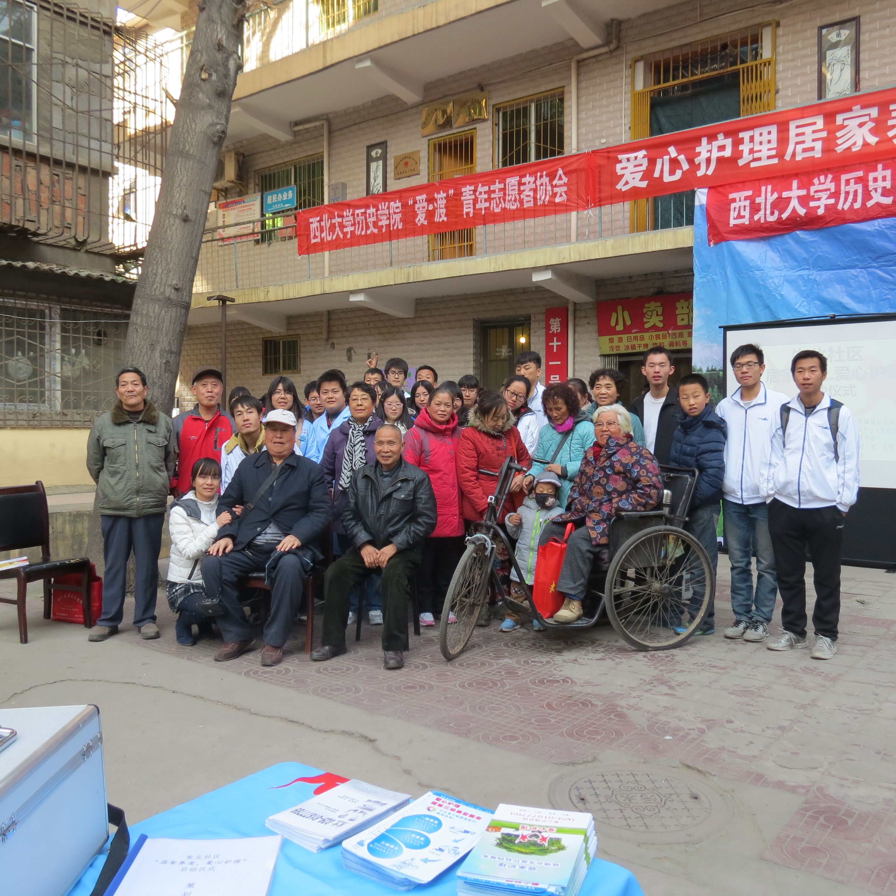 2013年12月11日下午,由西安市民政局、碑林区民政局、西安市碑林区“居家养老,爱心护理”服务中心、朱北社区管理中心和西北大学776net必赢官网“爱·渡”志愿者协会联合举办的朱北社区“居家养老,爱心护理”启动仪式在西安市朱北社区成功举办。“爱·渡”志愿者们积极参与了前期会场的布置,配合启动仪式的开展以及入户慰问等活动,现场气氛热烈,各项活动按计划有序进行。本次活动的成功举办得到了相关部门和社区老人的极大好评。
