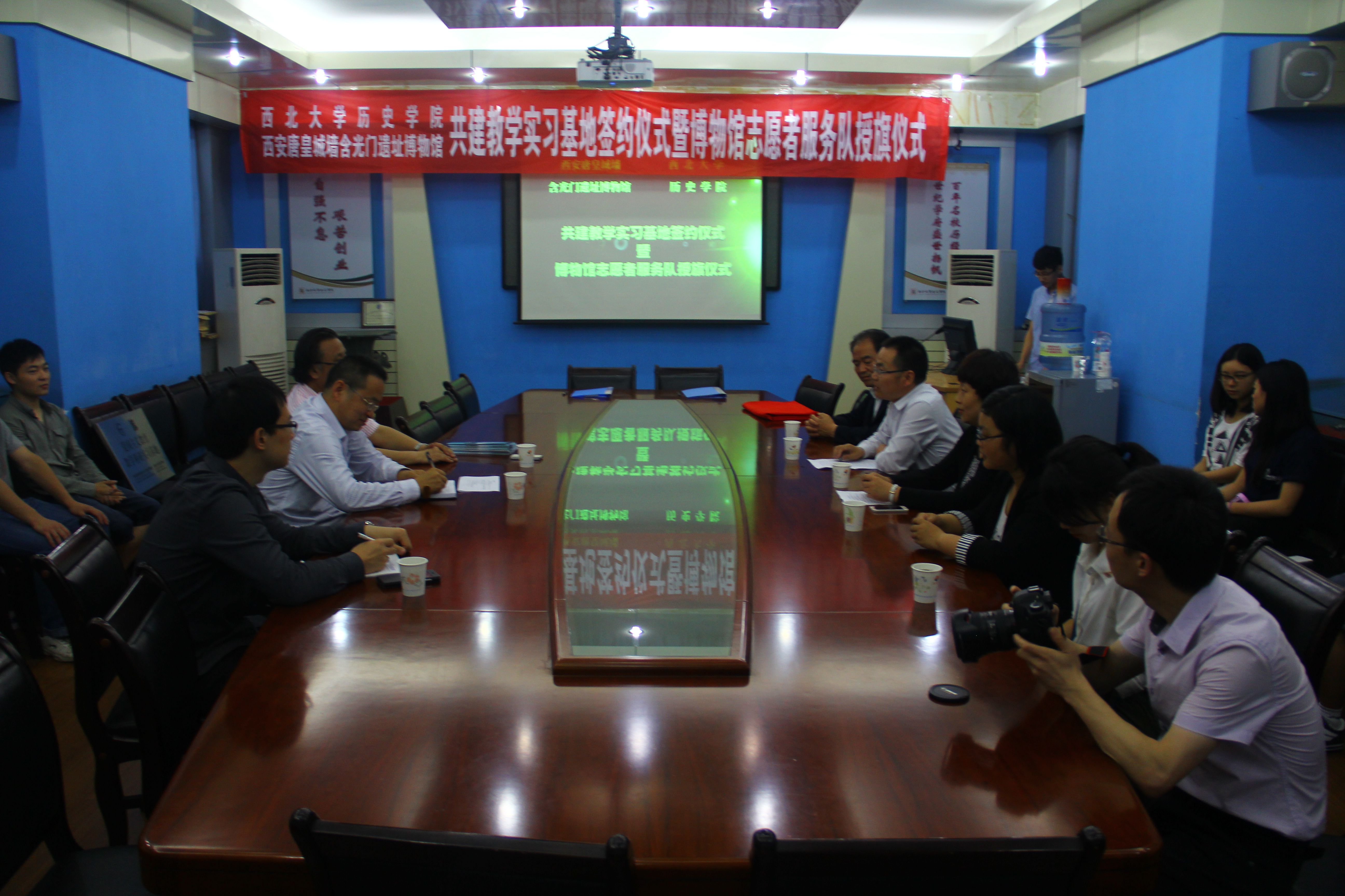 关于本次签约仪式,首先由博物馆副书记进行讲话,后由我校王新刚老师讲话,内容主要是回顾我校历史以及和含光门博物馆的友好往来,气氛十分的友好融洽。随后,是授牌仪式,接着是授旗仪式,均由志愿者代表翟佳明和陈豪同学参与。最后,全体人员合影留念。仪式圆满落幕。