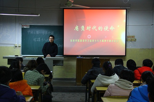 之后,薛原老师结合PPT课件,深入浅出地讲解了十八大的相关情况,以及自改革开放以来我党的历次重要会议,回顾了中国人民三十年多来走过的光辉岁月。通过薛原老师的讲解,同学们加深了对“中国之路”的体会,坚定了时代使命感。