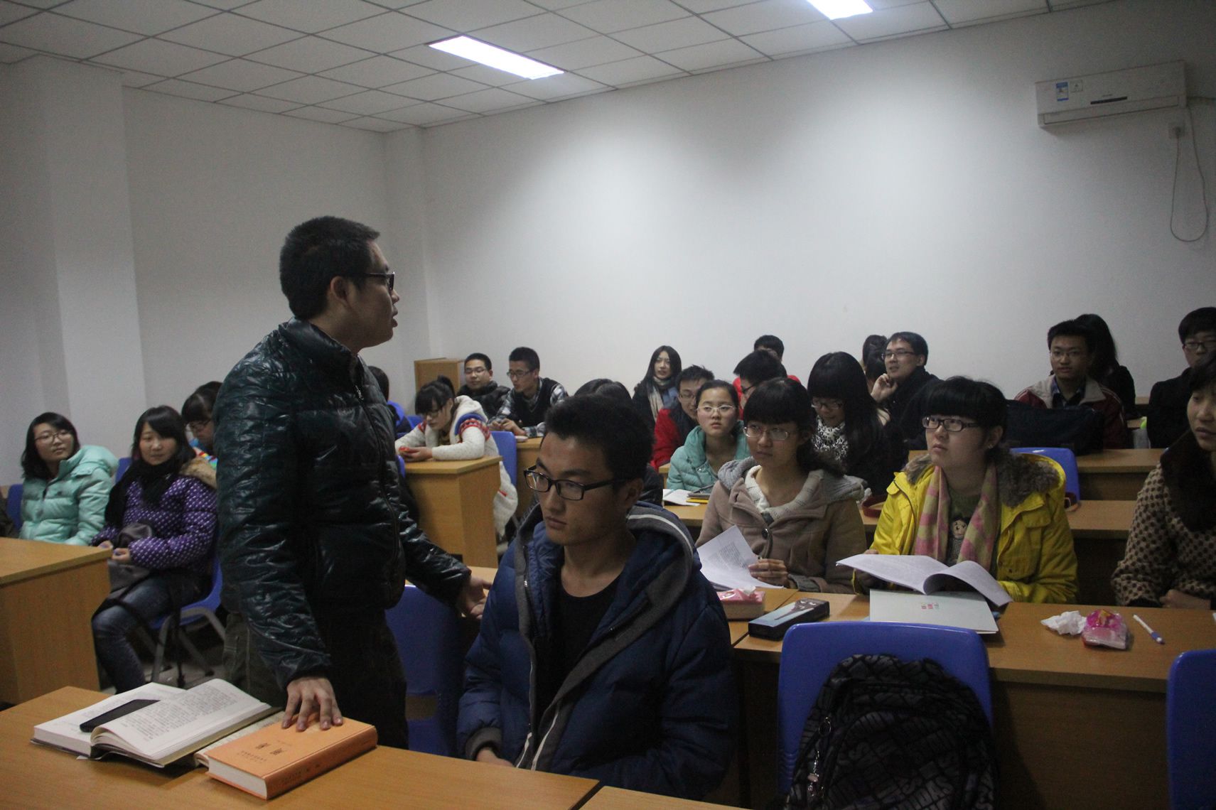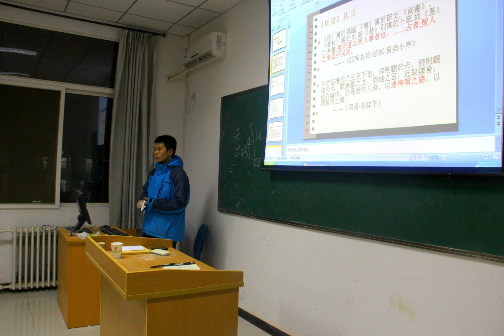 2013年12月18日晚七点,一场别开生面的学术交流会于420教室举办,776net必赢官网团委书记薛原老师、学生会代表和部分大一大二的同学参加了本次活动。交流会的主讲人是大二国学班的朱轩宇同学,主题是儒家经典——《周易》。在长达一个半小时的交流中,朱轩宇同学深刻与通俗兼备,严谨与风趣结合,带领同学们领略古老而又神秘的东方文化。