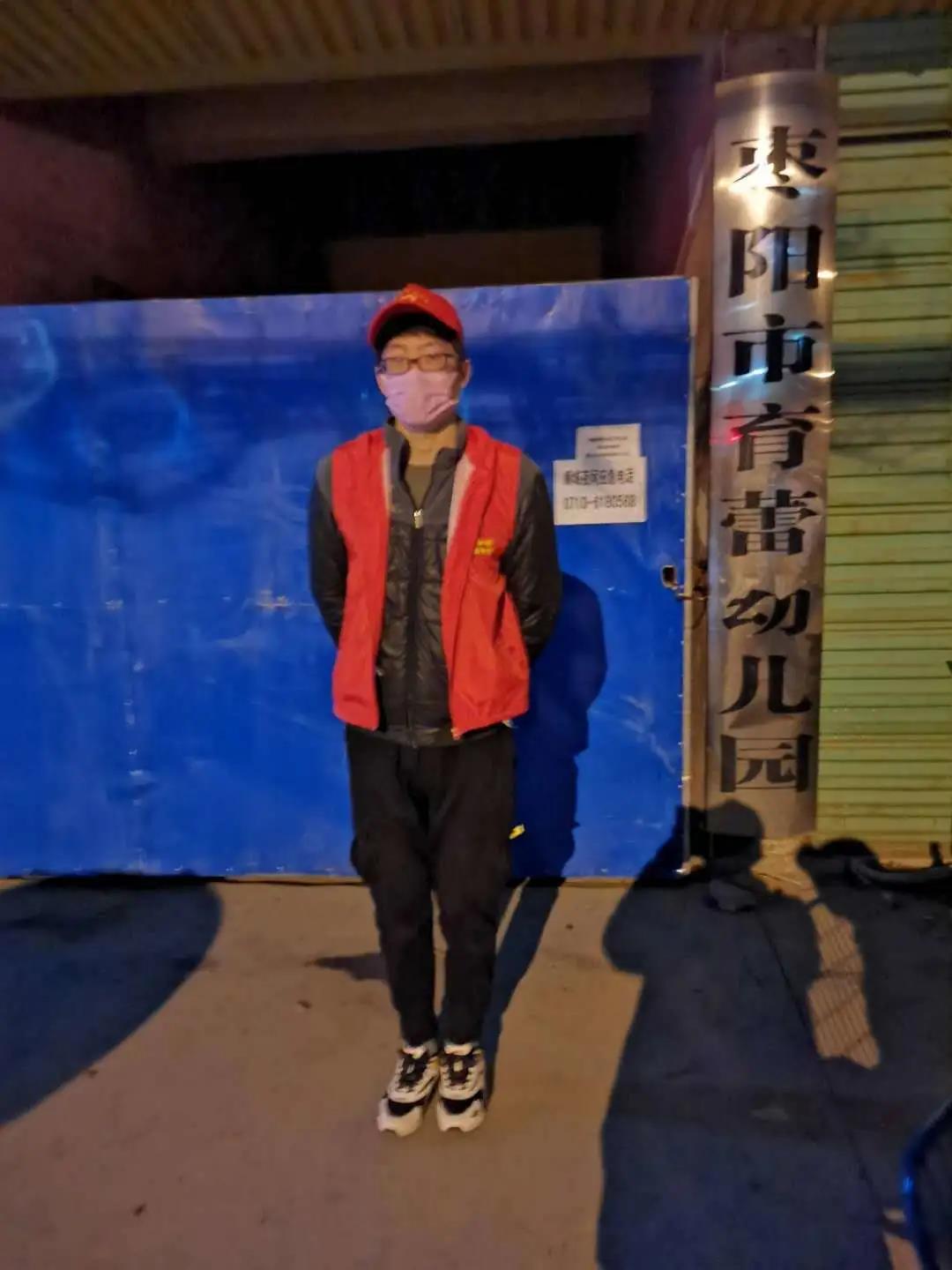 张文轩同学在当地顺城社区育蕾幼儿园防控点南北路口进行全天无间断驻守值班、防控宣传、封闭管理、劝退劝返、便民服务以及小区外卫生工作。