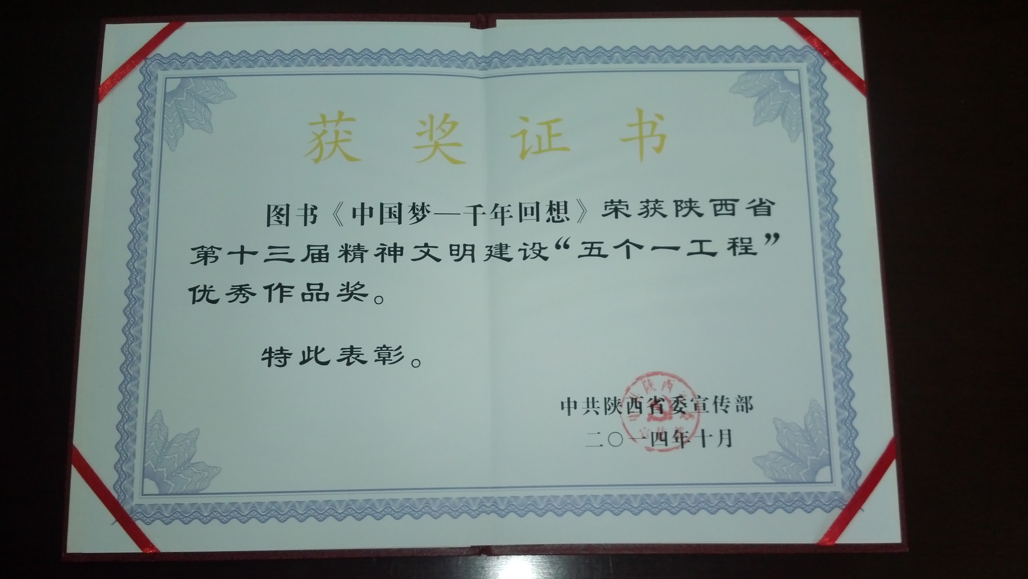 近日,中共陕西省委宣传部重大精品图书《中国梦——千年回想》由三秦出版社出版,并获陕西省第十三届精神文明建设“五个一工程”优秀作品奖。