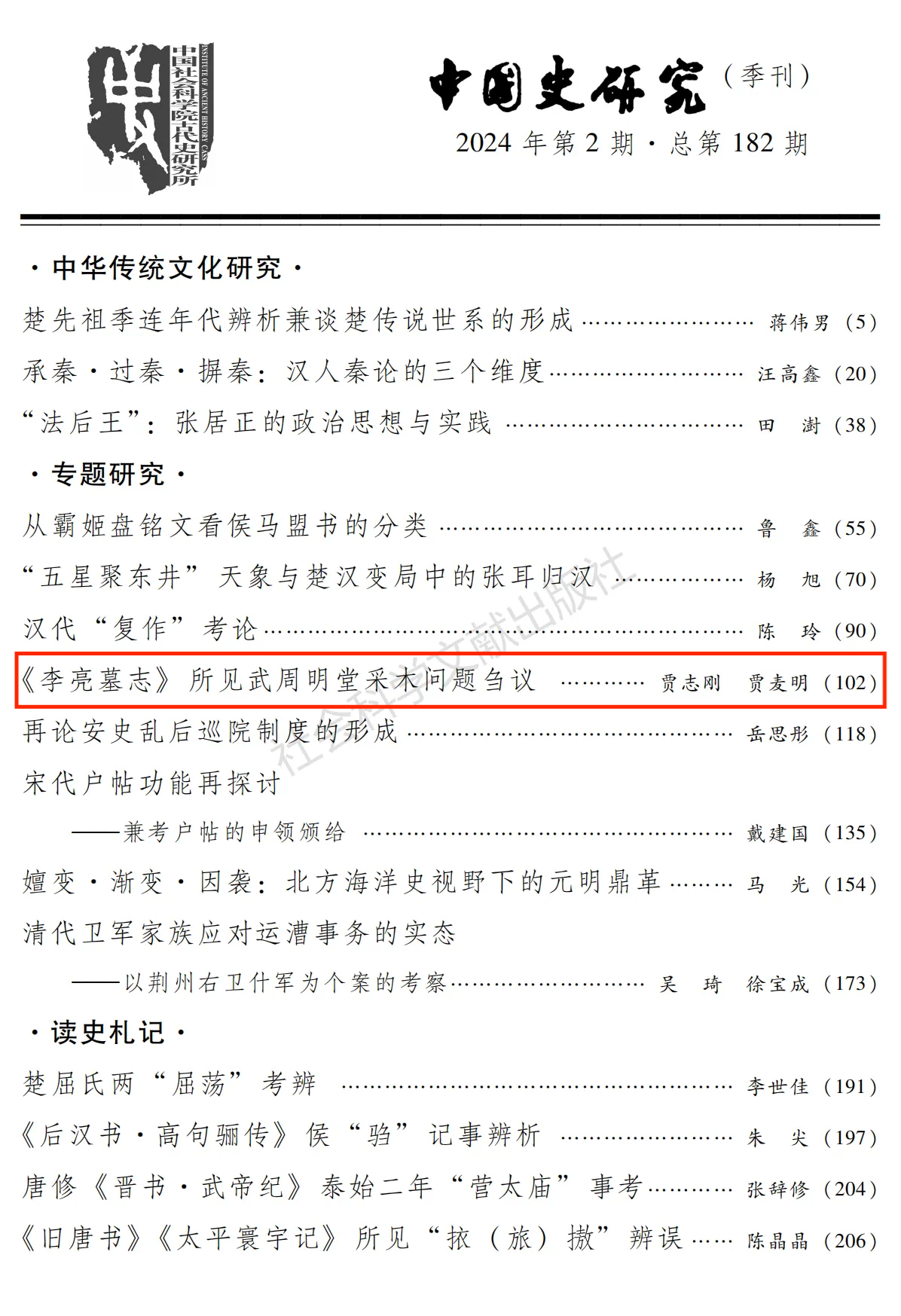 近日,《中国史研究》2024年第2期刊发776net必赢官网贾志刚教授为第一作者的专题论文《<李亮墓志>所见武周明堂采木问题刍议》。