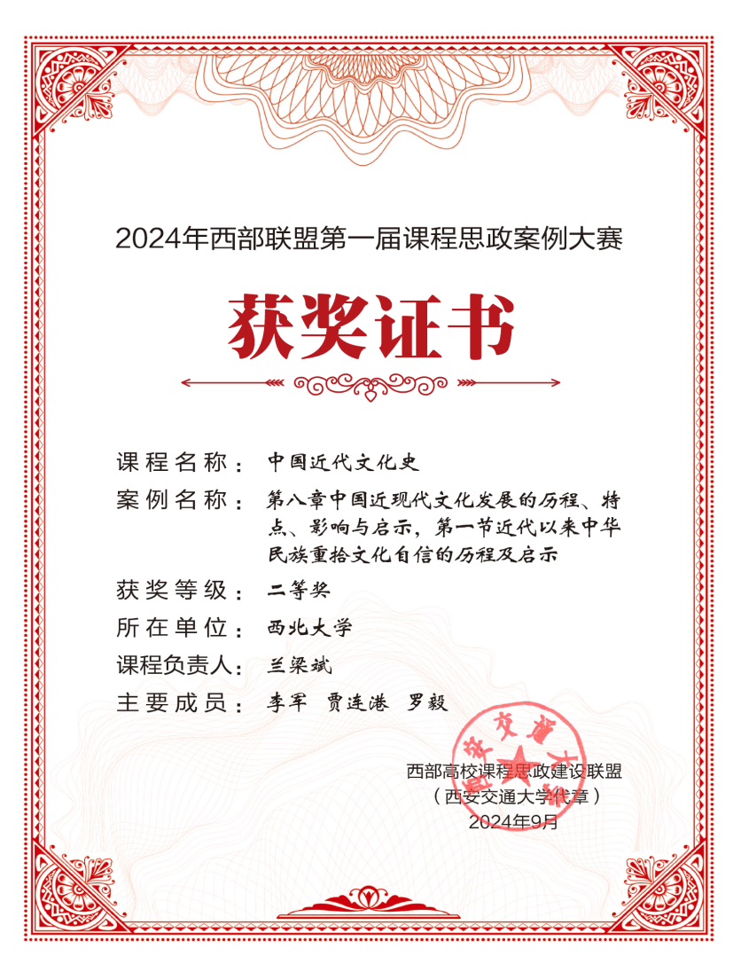 近日,由西部高校课程思政建设联盟主办,西安交通大学承办的西部联盟第一届课程思政案例大赛圆满落幕。此次大赛有来自陕西、甘肃、河南、宁夏、青海、新疆、江苏、吉林、湖北等地区高校的552位教师参加。经过专家综合评审,我院兰梁斌教授主持申报的“中国近代文化史•近代以来中华民族重拾文化自信的历程及启示”课程教学案例荣获二等奖。该案例以习近平新时代中国特色社会主义思想为指导,将思想政治元素融入课程教学之中,体现了课程思政建设的创新性。