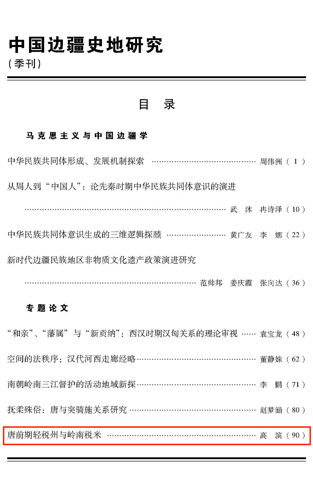 近日,我院青年教师高滨的论文《唐前期轻税州与岭南税米》在权威期刊《中国边疆史地研究》2024年第3期刊发。