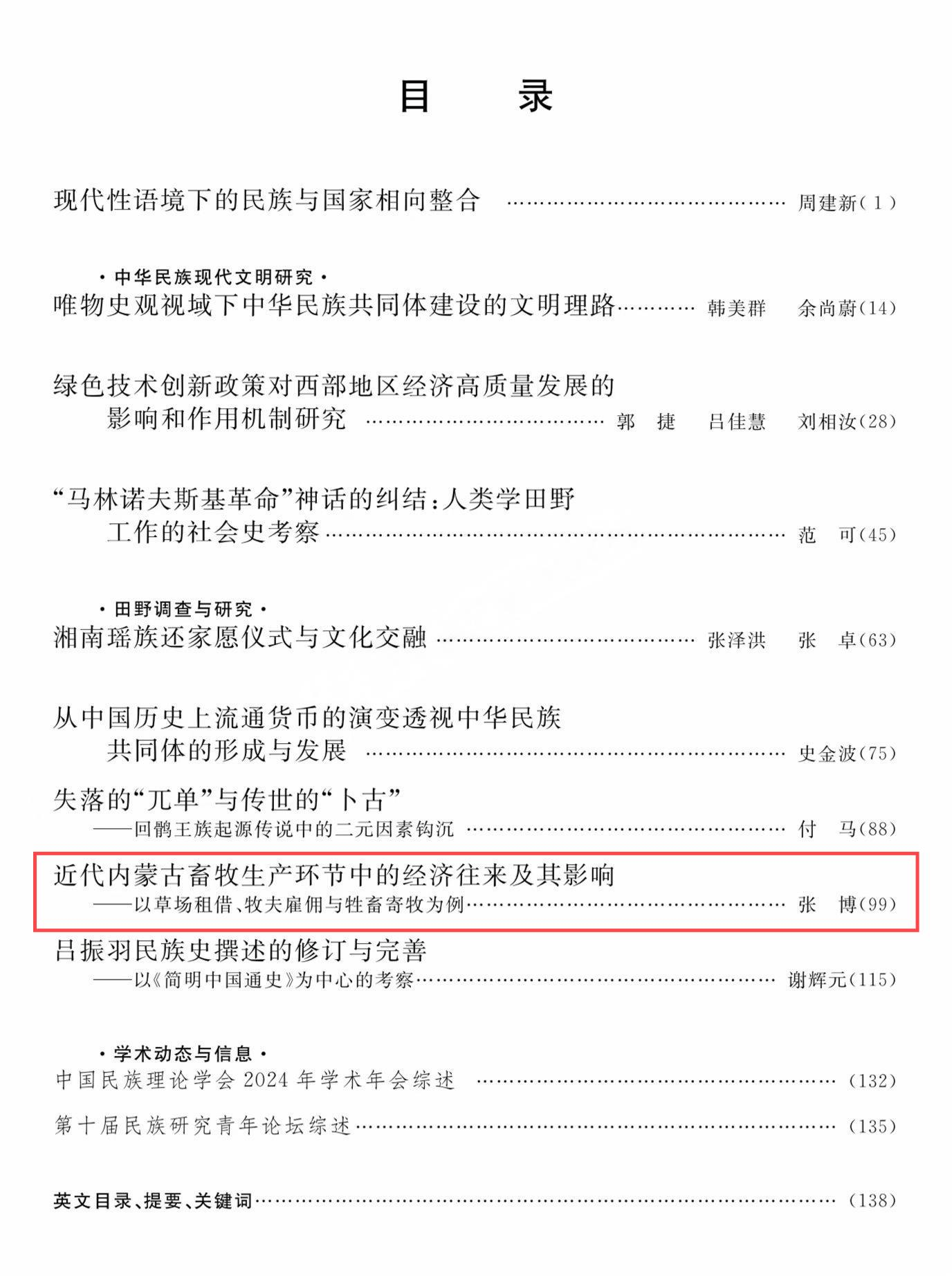 近日,我院张博副教授的论文《近代内蒙古畜牧生产环节中的经济往来及其影响——以草场租借、牧夫雇佣与牲畜寄牧为例》在权威期刊《民族研究》2024年第5期发表。