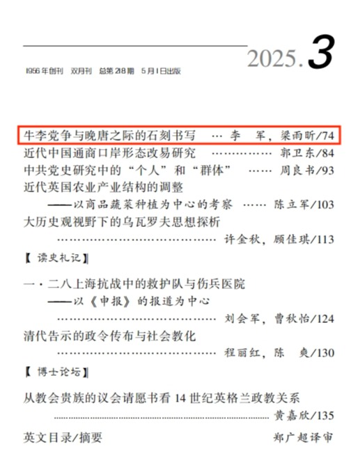 近日,我院李军教授和博士生梁雨昕合作撰写的学术论文《牛李党争与晚唐之际的石刻书写》在《史学集刊》2025年第3期刊出,全文约1.7万字。